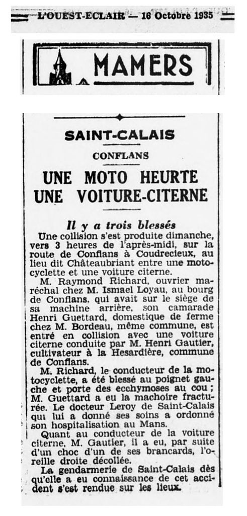 Grâce à la Bibliothèque de GeneaNet, j'ai retrouvé un article de l'Ouest-Eclair évoquant un accident de circulation impliquant mon arrière-grand-père Henri GAUTIER à Conflans-sur-Anille (72) le 13 octobre 1935. Pour le lien permanent vers l'article :...